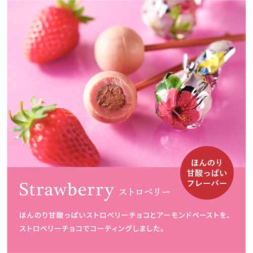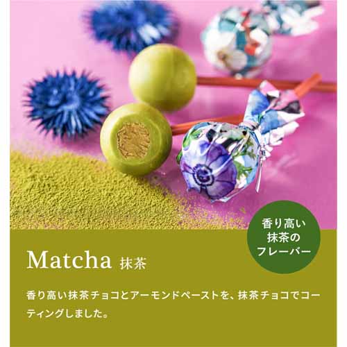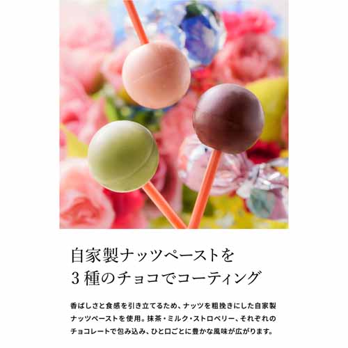 ナッツを粗挽きにした自家製ナッツペーストを抹茶・ミルク・ストロベリーのチョコでコーティングした品。ナッツの香ばしさと粒感がチョコレートと相性抜群。花柄の包み紙が華やかで、甘さと香ばしさのバランスも良く、満足感のある味わいです。