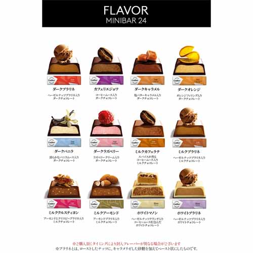 なめらかな高級ベルギーチョコレートで、12種類の多彩なフィリングを包み込んだミニバーの詰合せ。コクがありながら後味は驚くほど軽やかで、何本でも手が伸びてしまうバランスの良さが魅力です。24本入りで人数調整がしやすいこともポイントです。