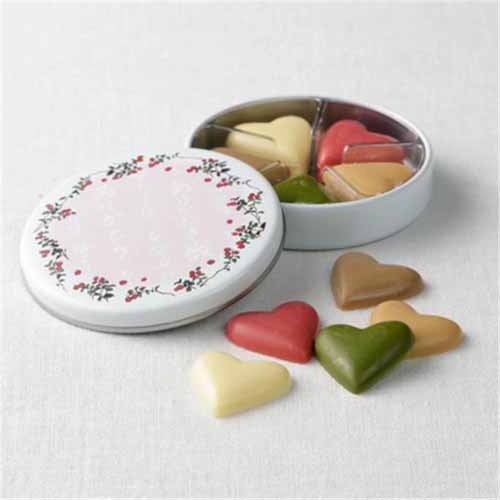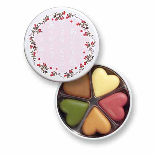 やさしい甘さのハート型チョコレートの詰め合わせ。素朴で親しみやすい味わいです。5色のチョコレートの色合いも美しく、目でも楽しめます。こけももの花を描いた可愛らしい缶入りで持ち帰りやすく、食べ終わった後も使えることも嬉しいポイント。