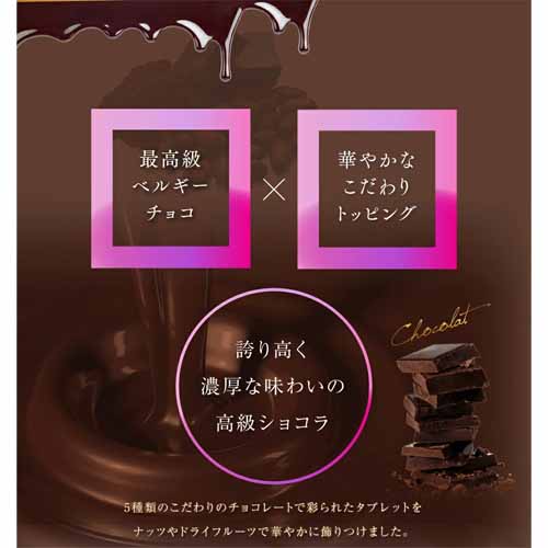 最高級ベルギーチョコに、ナッツやドライフルーツ、マカロンを贅沢にトッピング。オレンジをあしらった「ビター」や鮮やかなピンク色のマカロンやココナッツファイバーをあしらった「ミルク」、抹茶など彩り豊かな5種展開で、見た目も味も満足度の高い一枚です。