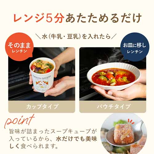 作り方は冷凍パウチに水や牛乳を加えて電子レンジで5分温めるだけ。お野菜の食感が良いので、冷凍食品を避けていた人もおいしくいただけますよ。