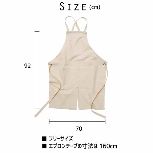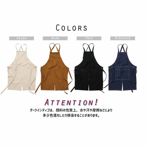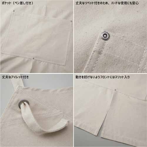 綿100%の厚手キャンバス素材(※ダークインディゴはデニム)を使用し、耐久性と風合いの良さを両立。クロスタイプで着脱しやすく、長時間の作業でも負担が少ない設計です。前面にはペン差し付きポケットと動きやすいスリットを配置。カラーはブラック・キャメル・ナチュラルなど展開し、名入れやプリント内容によって自由にカスタマイズ可能です。