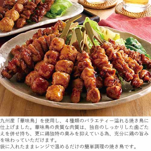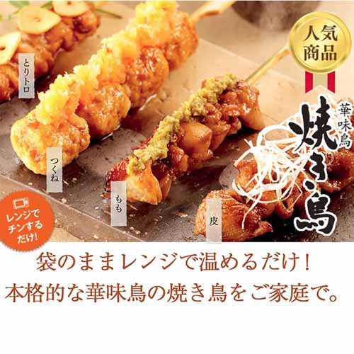 九州産“華味鳥”のもも・皮・つくね・とりトロの4種を食べ比べできるセット。肉質がしっかりしており、ジューシーでうまみが濃いのが特徴です。各1本入り×5袋で小分けになっているため、食べたい分だけ手軽に調理可能。香ばしさと食べ応えで満足感の高い一品です。