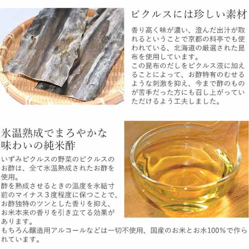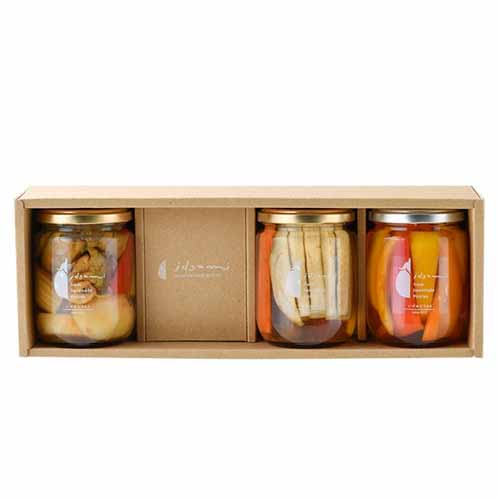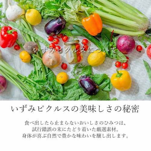 泉州野菜を中心に、水なす・パプリカ・焼き野菜の3種を詰め合わせたセット。昆布だしや氷温酢を使い、酸味がまろやかで食べやすい仕上がり。シャキッとした歯応えと素材の旨みが広がり、箸が止まらないおいしさです。