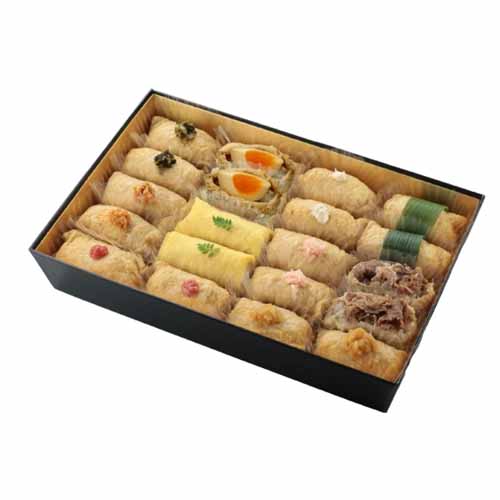 トリュフ・大豆ミート担々・薄焼き玉子巻・半熟煮卵・黒毛和牛しぐれ煮など、10種の多彩な味を楽しめるいなり寿司セット。全国各地の厳選食材を使い、見た目も美しく仕上げられています。ふっくらご飯と具材のバランスが良く、手軽に食べられる華やかな一品です。