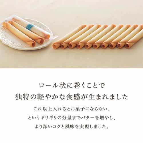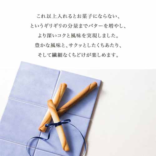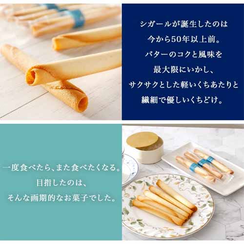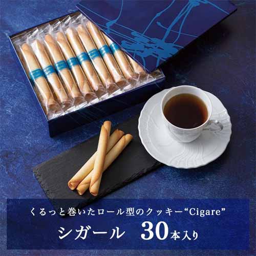 バターを贅沢に練り込んだ生地を丁寧に焼き上げ、くるりと巻いたシガールは、サクッとほどける繊細な口どけが魅力。香り豊かで軽やかな甘さが特徴です。30本入りでボリューム感があり、青缶の上品なデザインも手土産にぴったり。