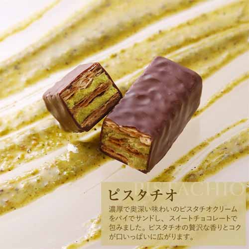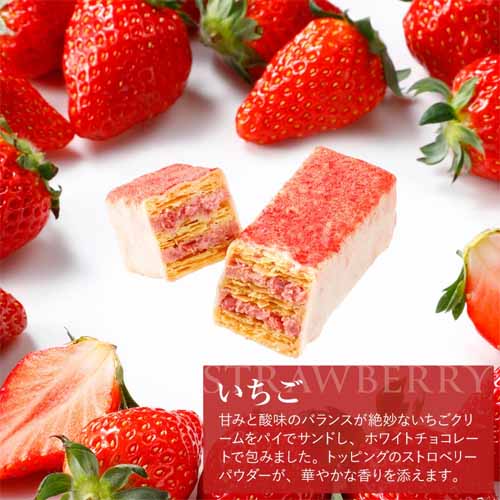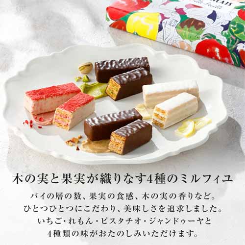 いちご、レモン、ピスタチオなど、果実やナッツの味わいを閉じ込めたクリームやチョコをサクサクのパイでサンドした16個入りセット。個包装で食べやすく、手も汚れにくいのが嬉しいポイント。カラフルなパッケージは、テーブルを一気に明るくしてくれます。