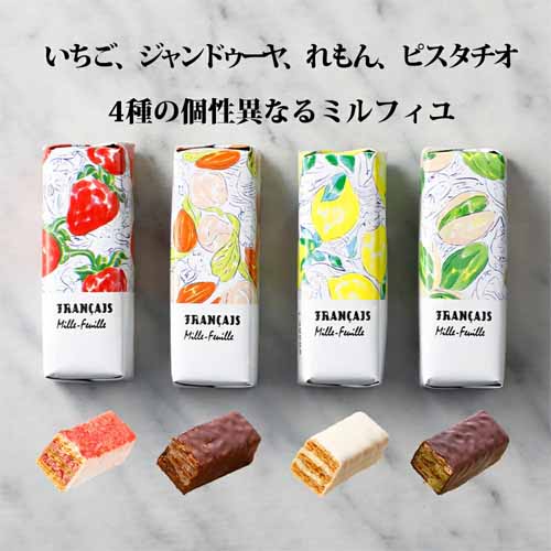 テーブルに並べるだけで華やぐフランセの「ミルフィユ」は、宅飲みの手土産にぴったり。ひと口サイズなのに、フルーツやナッツの風味がしっかり感じられて満足感も◎。ゲストの人数に合わせて個数を選べる柔軟性もあり、気軽につまめる“甘いもの枠”として、とても頼れる存在です。
