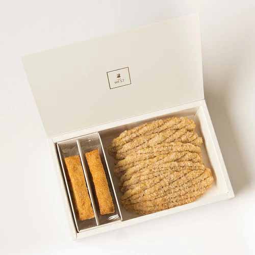 銀座ウエストの焼き菓子は、宅飲みを優雅なアフタヌーンティーパーティーのような雰囲気に変える存在。チーズバトンは塩気とコクが効いていて、ワインやビールと相性抜群。甘いものが得意でない人にも配慮できるのが嬉しいポイントです。リーフパイは幅広い年代に好まれる「外さない」手土産です。