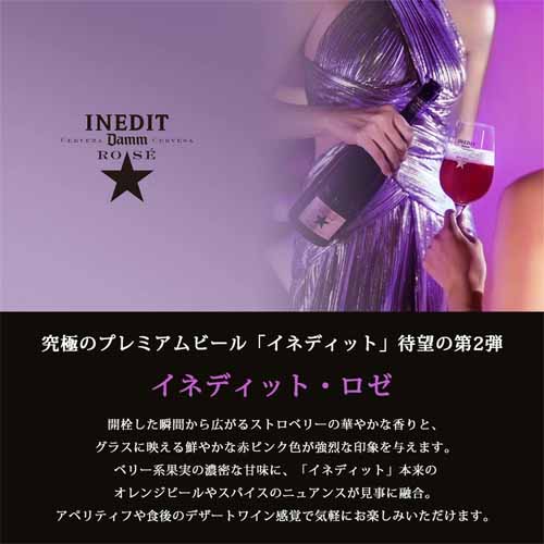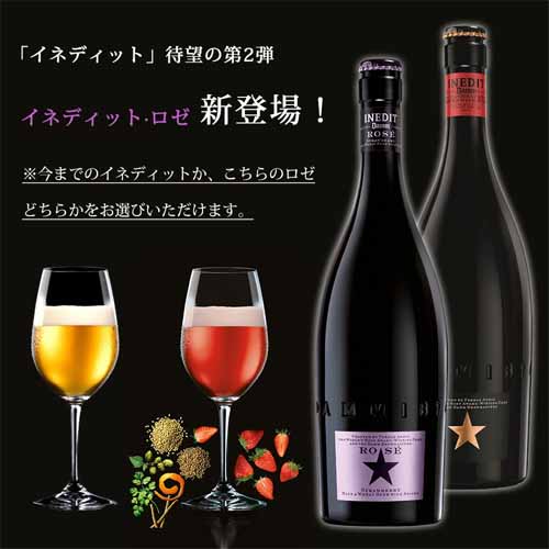 イネディットは小麦ビールをベースに、コリアンダー・オレンジピールなどを加えた繊細でエレガントな味わいが特徴です。大瓶ならではの存在感で、グラスに注ぐ時間すら特別に仕上げてくれます。ロゼタイプはストロベリーやスパイスが香るデザートワイン感覚の一本で、食後の一杯にも最適です。