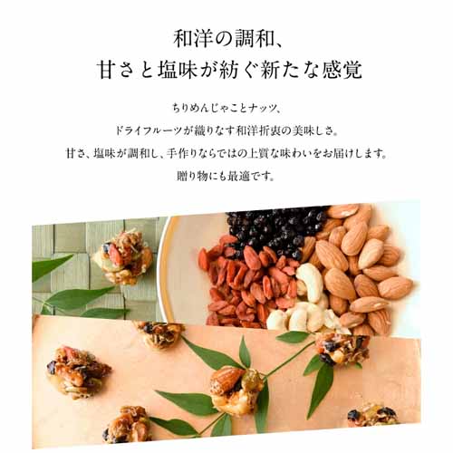 甘いものだけでなく“しょっぱい系のおやつ”があると宅飲みはぐっと楽しくなります。ちりめんじゃこ・ナッツ・ドライフルーツを合わせた和洋折衷の味わいは、子どもから大人までつまみやすい万能おやつです。小さくても上品で存在感があり、差し入れとして印象に残ります。