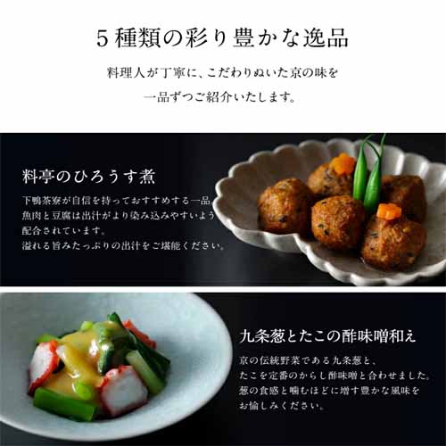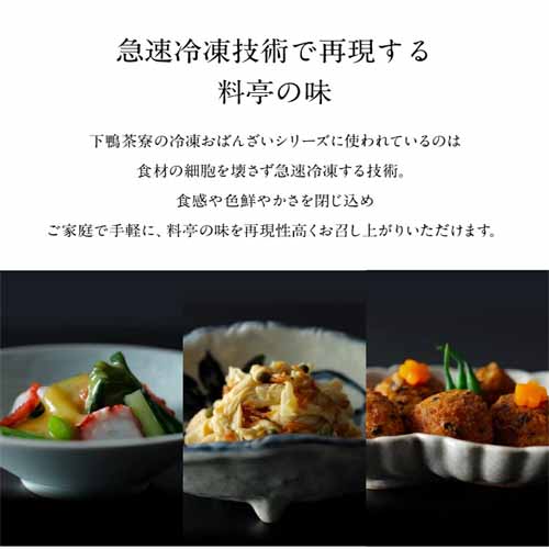 創業1856年の下鴨茶寮が手がける、京野菜・湯葉・九条ねぎなど京都らしい素材を丁寧に仕上げたおばんざいセット。急速冷凍でつくりたての味を閉じ込め、解凍するだけで料亭の味が楽しめます。ひろうす煮や酢味噌和えなど彩り豊かな料理が揃い、見た目も華やかです。