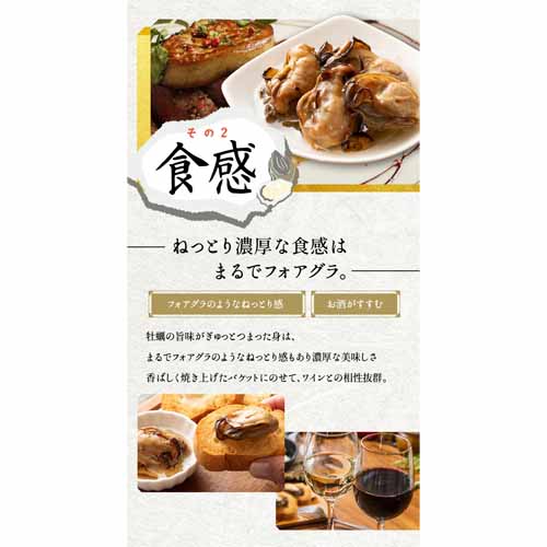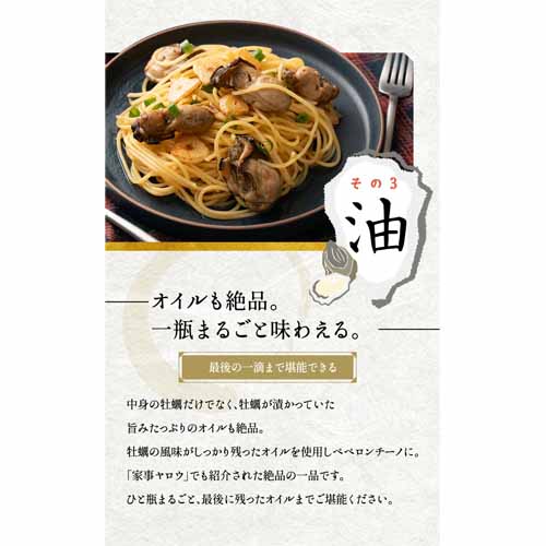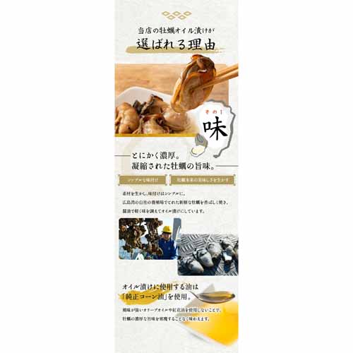香ばしく焼いた牡蠣を軽く醤油で味付けし、純正コーン油へ漬け込んだシンプルな製法。牡蠣本来のうまみが凝縮された濃厚な味わいが特徴です。バゲットに乗せるだけでお店のようなおつまみになります。化粧箱なしの気軽さも宅飲み向き。
