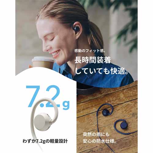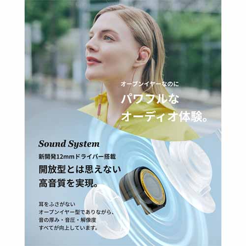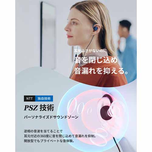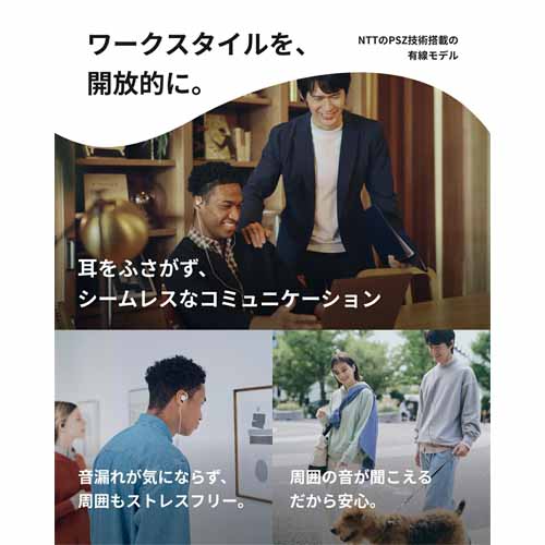 耳をふさがないオープンイヤータイプの有線イヤホンです。両耳約7.2gの軽量性と耳掛け式の安定感によって快適な装着感を実現。音漏れを抑えるPSZ技術でオフィスや外出先でも使いやすく、マイク搭載によりオンライン会議で重宝します。