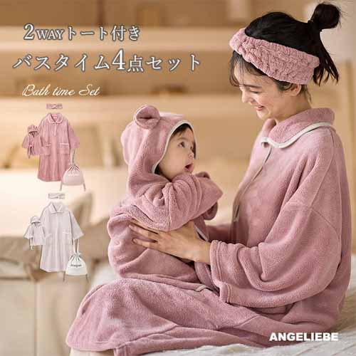 ベビー用のフード付きバスローブとママ用のバスローブワンピに加え、ヘアバンドと2WAYトートまでセットになった豪華な詰め合わせは、出産祝いや節目のプレゼントにぴったり。親子でお揃いを楽しみながら、毎日のバスタイムを特別な時間に変えてくれます。
