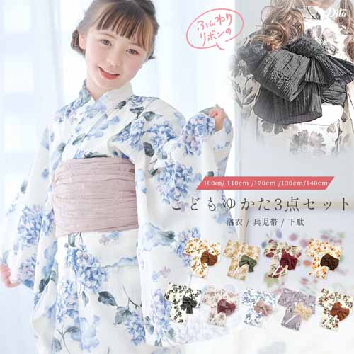 腰ひも付き浴衣・しわ兵児帯・下駄が揃った3点セットで、届いてすぐに着られる手軽さが嬉しいポイント。生地は通気性に優れた綿100%で着心地も快適。ママ向け浴衣とのコーディネートも多数用意されています。