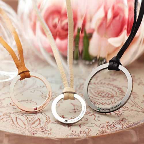 3本セットで、パパ・ママ・子どもそれぞれに対応。誕生石やコーティングカラー、革紐の色味や刻印内容などを細かく指定できることが最大の魅力で、一生モノの記念になります。