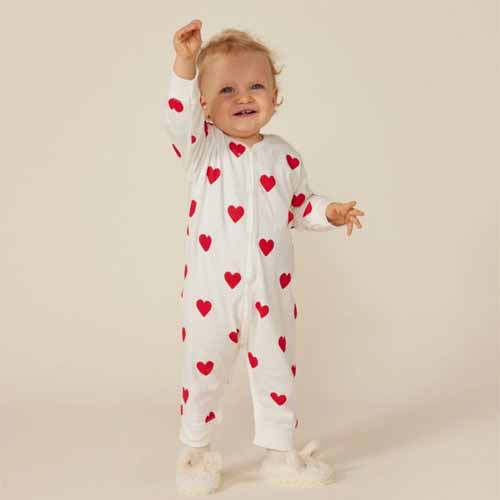定番のハートプリントを親子でお揃いにできるのが魅力。キッズから大人サイズまで充実していて、シンプルながらフレンチテイストを感じさせるデザインが特徴です。カジュアルでありながら品があるため、デイリーにもお出かけにも対応します。