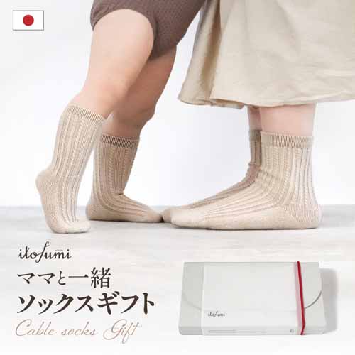 コットン素材で通気性もよく、日本製で品質にも安心感があります。ゴムを使わずに高い伸縮性を実現した設計で、しめつけず跡がつきにくい仕様&すべり止め付きがうれしいポイント。親子サイズが揃って、専用ギフトボックスに入っているのでそのまま渡せるのも◎。