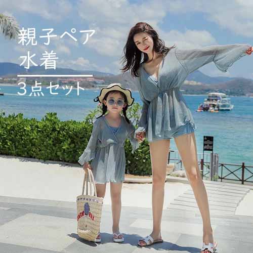 子ども用もママ用もラッシュガードと水着上下セットがついた一式アイテム。キュートな水色のカラーリングで、親子そろってキラキラショットを残すことができます。サイズ展開が豊富で姉妹分も揃えやすいのが魅力です。