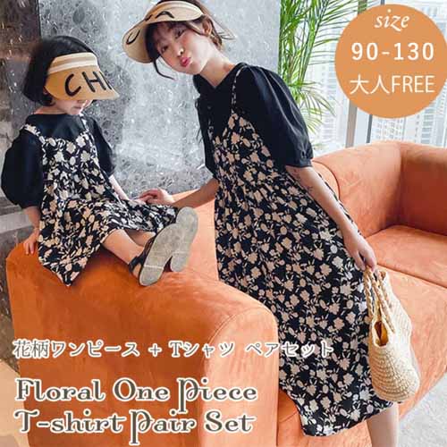 女の子とママでペアルックが楽しめる、Tシャツとキャミワンピが一体になった重ね着風のワンピースセット。カジュアルすぎない程よいデザインで、ちょっとしたお出かけやイベントにも重宝します。