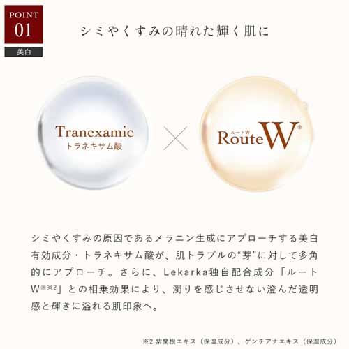 シミやくすみの原因となるメラニン生成にアプローチするトラネキサム酸と、レカルカの独自配合成分であるルートW®との相乗効果で、澄んだ透明感のある肌に導いてくれます。9種の保湿成分が肌荒れを防ぎながら、潤いもしっかり閉じ込めます。