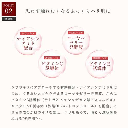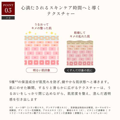 肌にのせた瞬間から滑らかに広がるテクスチャー。リッチな肌ケア時間をプレゼントして、年齢や外的ストレスに負けない美肌づくりをサポートしてあげましょう。