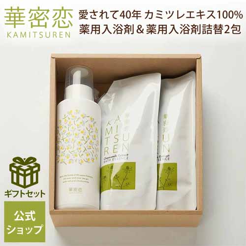 カミツレとは、ハーブの女王と呼ばれ、4000年以上も前から薬草として親しまれてきたジャーマンカモミールの和名。 「華密恋(カミツレン)」の入浴剤は、すぐれた保湿力で肌にうるおいを与え、化学成分不使用で乾燥・湿疹・あせもなど肌トラブルを鎮めてくれます。