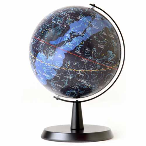 昭和12年創業、地球儀製作の功績によって勲五等瑞褒賞などを受賞している国産地球儀メーカーの一品。マイナス一等星を含む7段階の星の等級による星図には、変光星・星団・銀河・ 星雲・太陽の南中位置・88星座の境界線・星座絵などが記載され本格的。星座名と主な星名はすべて欧文併記で、大人から子供まで知的好奇心をくすぐります。