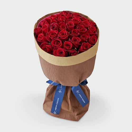 優美な赤バラを束ねた贅沢な花束。30本のバラは「感謝」と「敬意」を象徴し、大切な人への心からの想いを表現します。信頼のおける日比谷花壇クオリティーでありながら、4日後以降でお届け日を指定できるのが嬉しいポイントです。
