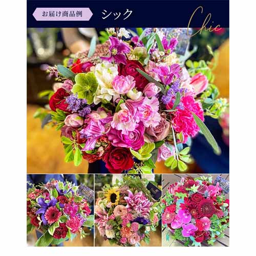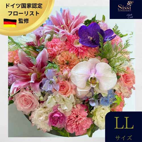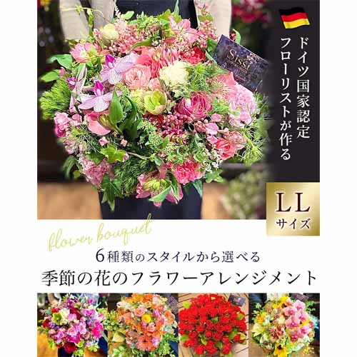 フローリストによるデザインで、テーマを6種類から選べるため相手の雰囲気に合わせやすいのが魅力です。LLサイズで見映えもよく、届いた瞬間に気分が上がる華やかさがあり、お祝いシーンにも映えます。