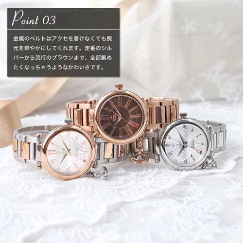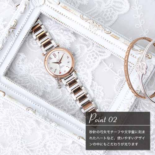 揺れるオーブや弓矢モチーフの秒針、ハート入りの文字盤など、細部までブランドの世界観が詰まっています。メタルバンドの華やかさもあり、腕元にしっかり存在感を出せるのが魅力です。