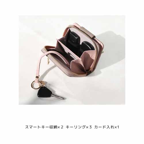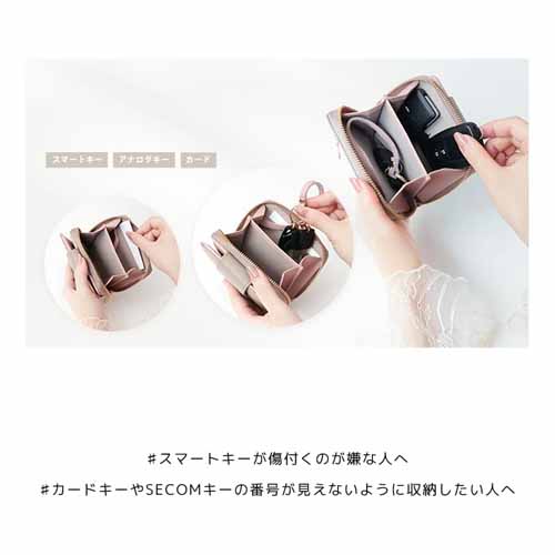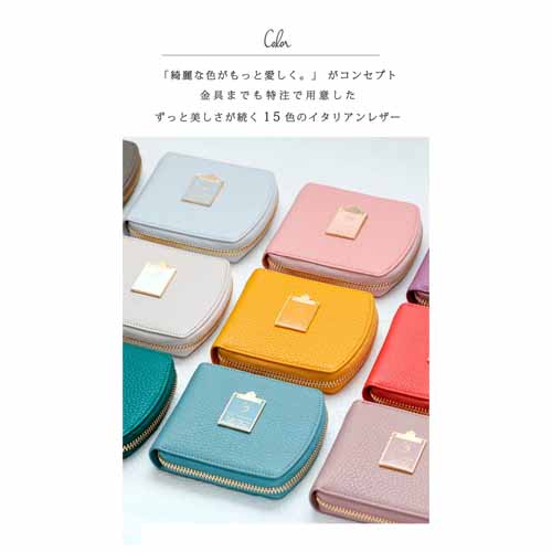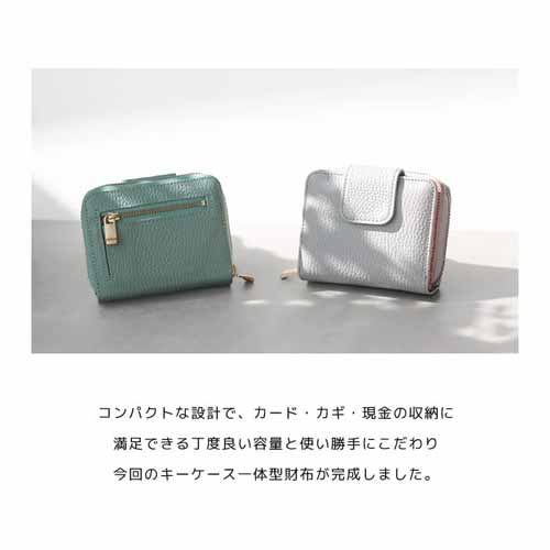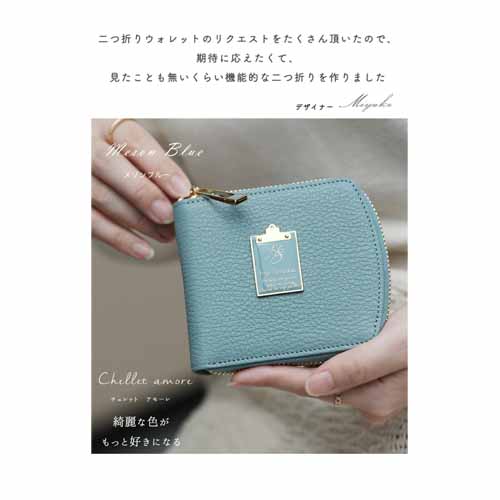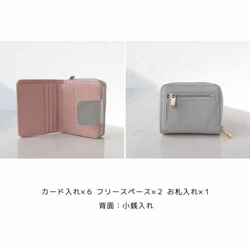 二つ折りで持ち歩きやすいサイズ感ながら、必要な収納力はきちんと確保しやすい設計です。見た目に可愛らしさがありつつ、大人っぽく持てるバランスで、日常使いのしやすさにも優れています。