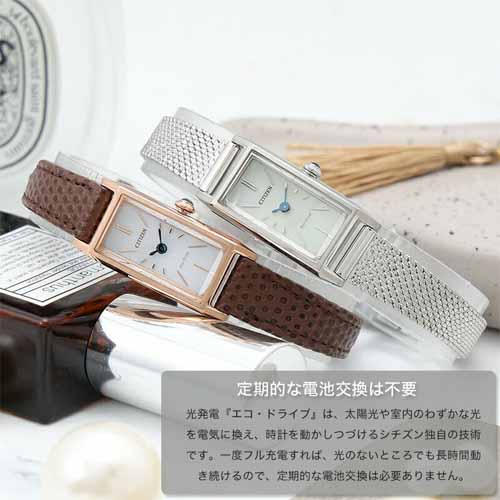 光発電エコ・ドライブを搭載しているため、電池交換の手間を減らしやすいのが魅力です。繊細でアンティーク感のあるデザインが手元を上品に見せ、通勤にも休日にもなじみやすい一本です。