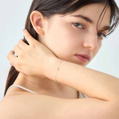 K10MPGのやわらかな色味とダイヤモンドの繊細な輝きが、手元を上品に見せてくれます。レイヤードしやすいデザインなので、手持ちのアクセサリーとも合わせやすく、長く愛用してもらいやすいです。