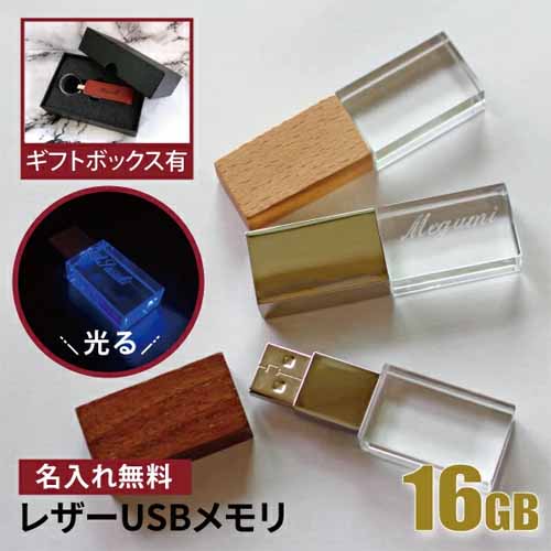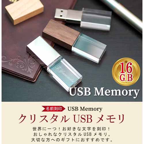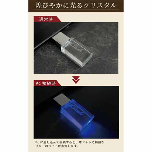 持ち手部分がクリスタル仕様で、差し込むと光るデザイン。16GB容量で日常使いに十分なスペックです。レーザー刻印による名入れは無料対応。コンパクトで持ち運びやすく、PC周りに置くだけでも気分が上がります。