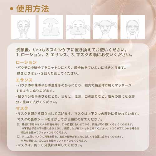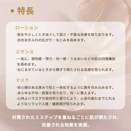 除去化粧水・美容液・マスクが一体になった集中ケアセット。不要な角層をやさしく取り除き、美容成分が浸透しやすい肌へ導きます。上下に分かれたマスクの密着感と上品なローズの香りで、使う時間そのものがご褒美に感じられる使用感です。