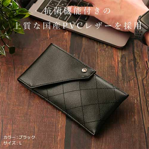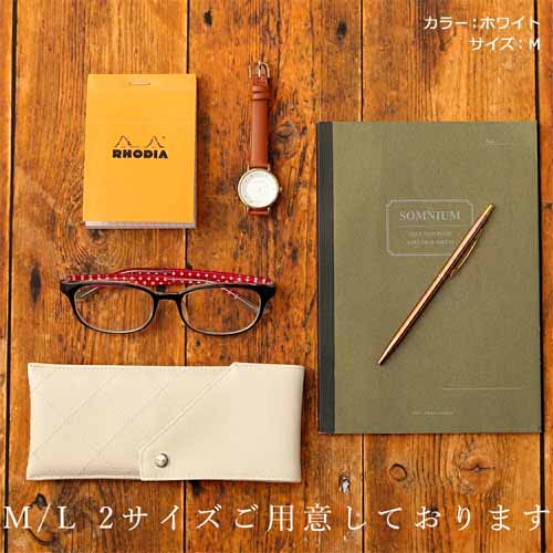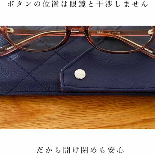 内側全体に上質な日本製生地を使用し、出し入れのたびにレンズの軽い汚れを拭き取る設計。4mmウレタン入りで程よい形状を保ち、バッグの中でも安心です。撥水性のあるPVCレザーで汚れにくく、軽量で持ち運びやすい点も魅力。