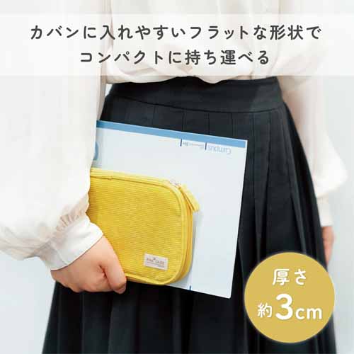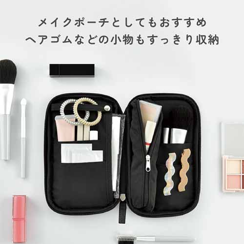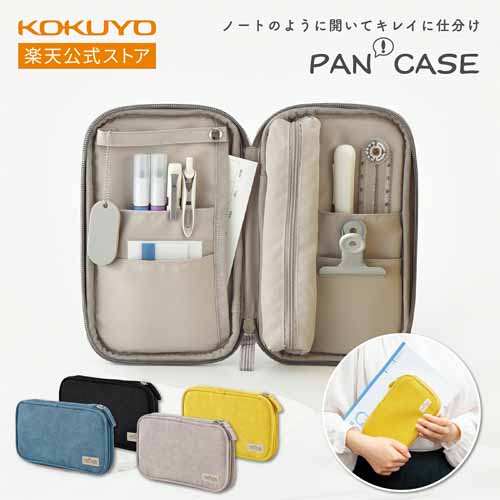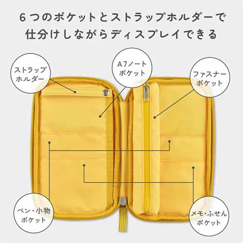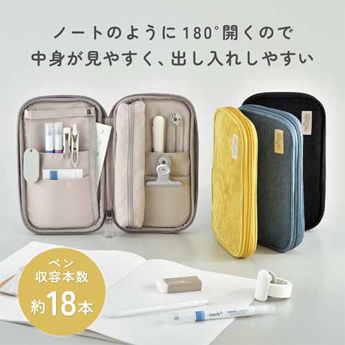 ノートのように開く構造で、中身を一目で確認できる設計。6つのポケットと約18本収納可能な容量が魅力です。フラット形状で持ち運びやすく、文房具以外の小物整理にも活躍。4色展開で好みに合わせて選べます。