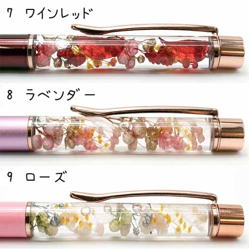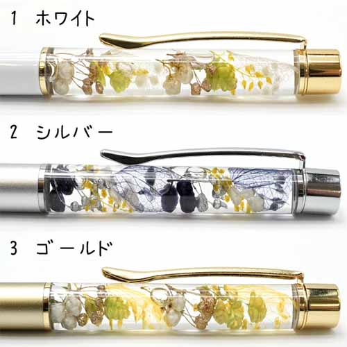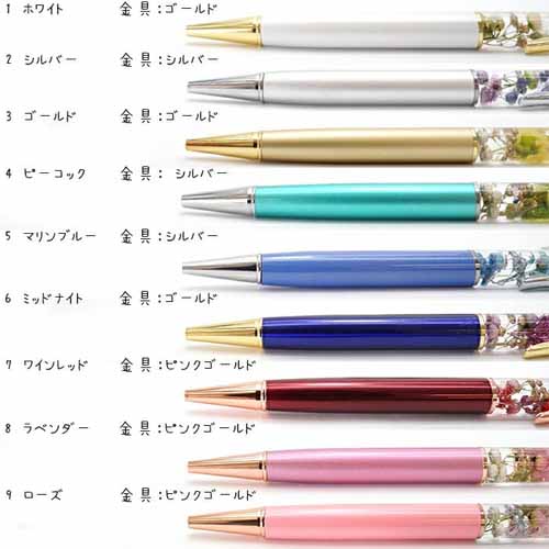 透明感のあるボディにドライフラワーを閉じ込めたハーバリウムデザイン。手元でさりげなく光り、使うたびに気分が上がります。カラーバリエーションも豊富で、彼女の雰囲気に合わせて選択可能。軽くて書きやすい点も実用的です。