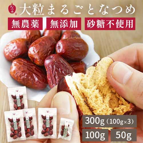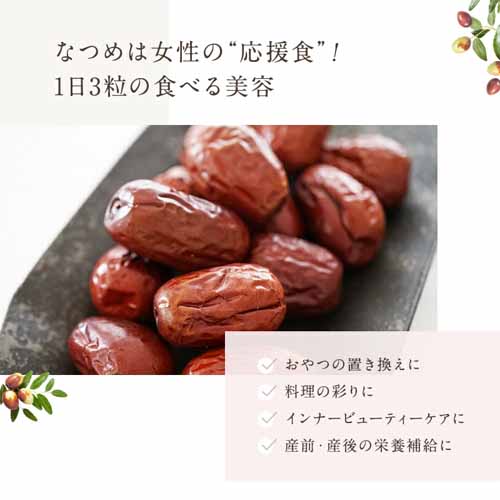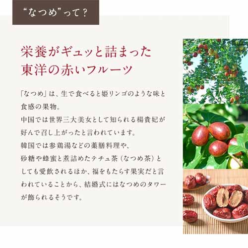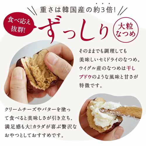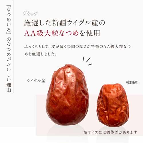 新疆ウイグル産のAA級大粒なつめを使用。乾燥の過程でも漂白剤などの化学物質は一切使用しておらず、無農薬・無添加で自然な甘みとふっくらした果肉が特徴です。そのまま食べても、お茶請けとしても楽しめます。