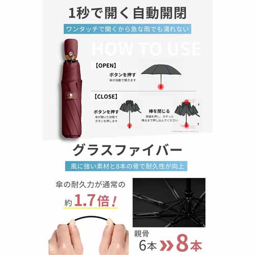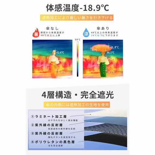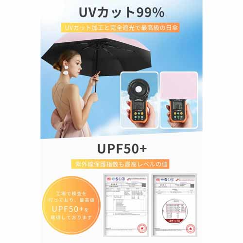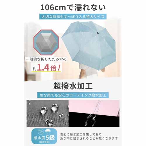 ワンタッチ自動開閉式で片手操作が可能。直径約97cmの大きめサイズながら軽量設計で、雨の日も安心です。UVカット99%・完全遮光で晴雨兼用。超撥水加工により乾きやすく、季節を問わず活躍します。