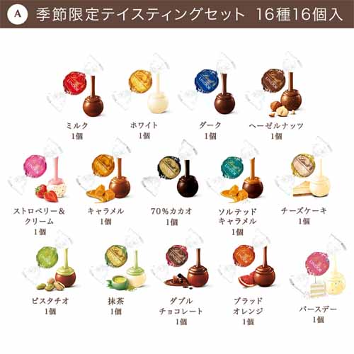 スイス発プレミアムチョコレートブランドの、オンラインショップでの人気セット。なめらかなフィリングと大粒サイズが特徴で、16個入りのボリュームも満足度を高めます。カラフルな包み紙もギフト映えします。