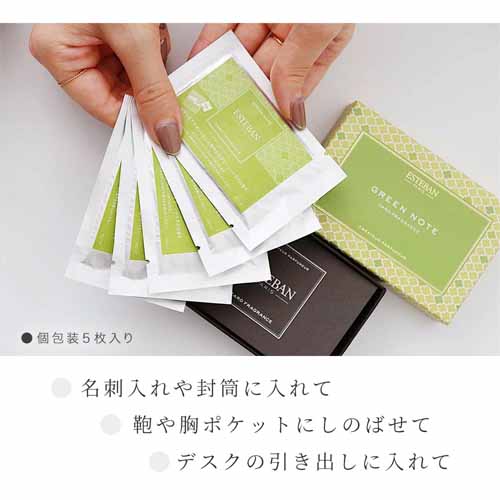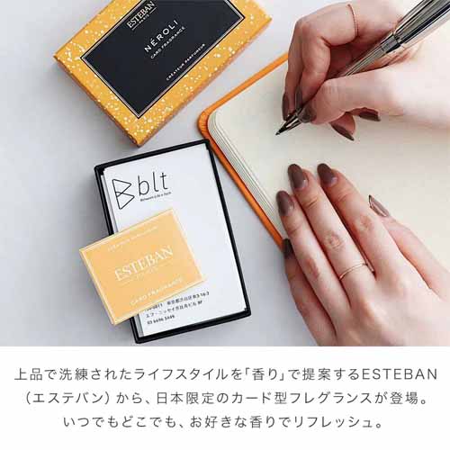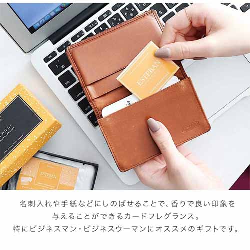 天然香料を用いた上質な香りを、カード型に閉じ込めたフレグランス。スクエア型で名刺入れにすっきり収まります。全9種の香り展開で好みに合わせて選びやすいことも魅力。外箱は名刺ケースとして再利用できます。