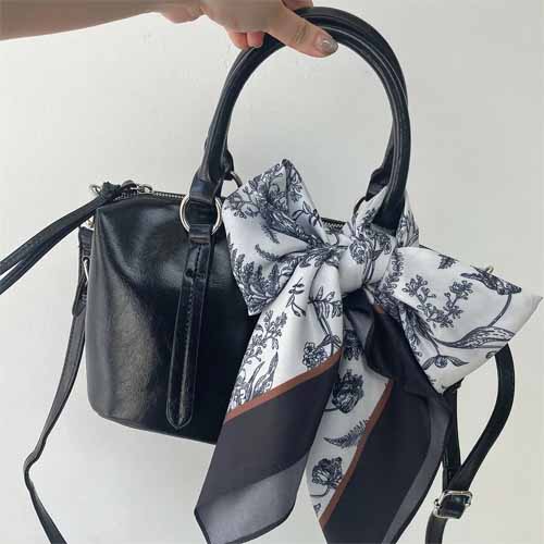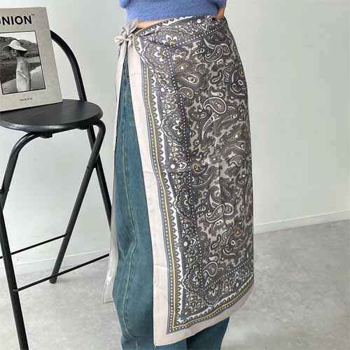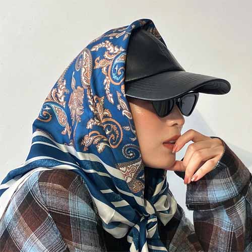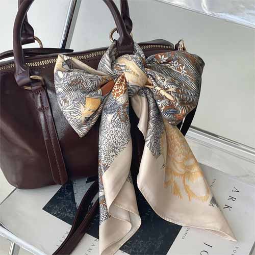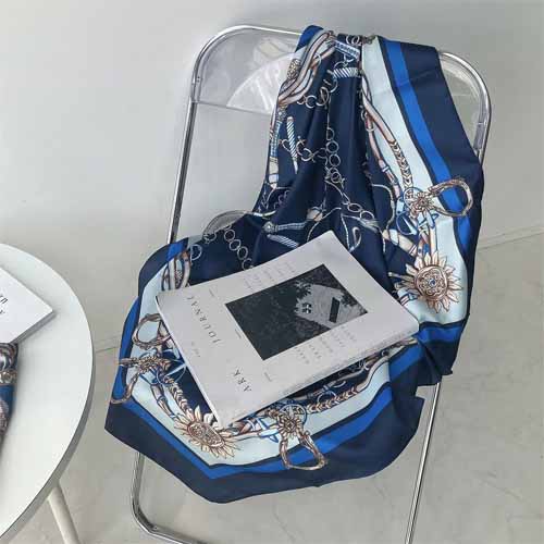 90cm×90cmの大判サイズで、首元・肩掛け・バッグアレンジなど幅広く使えます。ヴィンテージライクな風合いで一枚一枚に表情があり、ファッションだけでなくインテリアとして飾っても映えるデザインです。