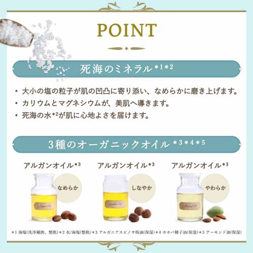 死海の塩で古い角質を落とし、3種のオーガニックオイルでしっとり仕上げるソルトインオイル処方。洗い上がりはなめらかで、香りも上品。コンパクトサイズで持ち運びやすく、旅行先やジム用にも使いやすい設計です。