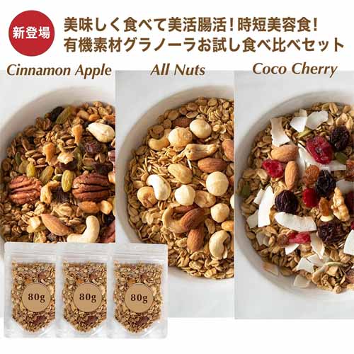 無添加・砂糖不使用・グルテンフリーの自家製ローストグラノーラ。香ばしさと素材の風味が際立ち、低GIで美容や腸活にも配慮されています。ポスト投函対応でスムーズに受け取れることもポイントです。
