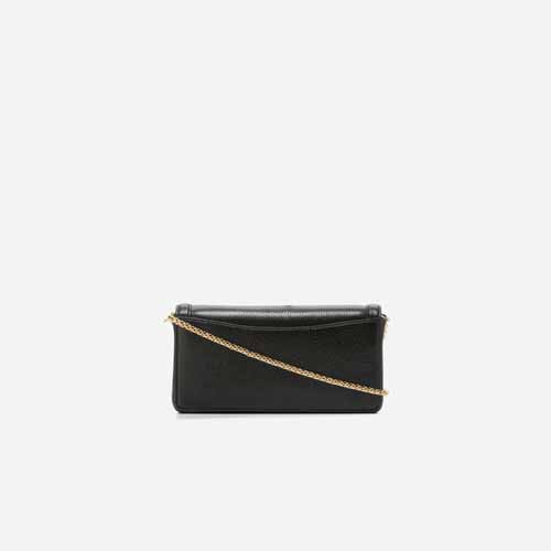 光沢感あるチェーン付きのレザーウォレットバッグ。コンパクトなサイズにカードや現金をスマートに収納でき、お出掛けを身軽にします。忙しいママでも気軽におしゃれを楽しめる軽やかで品のあるデザインも魅力です。