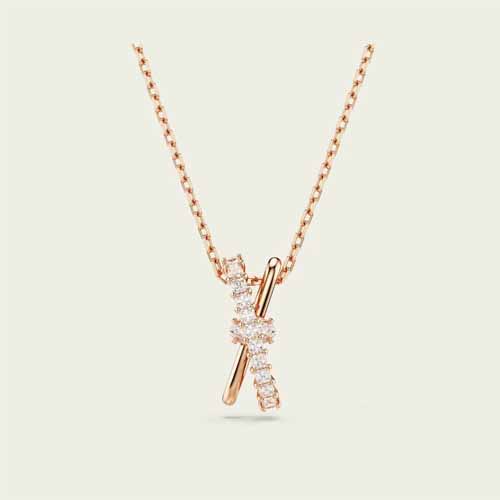 スワロフスキーのアイコニックな輝きを放つ「Hyperbola」シリーズのペンダントです。2つの細長いエレメントが交差され、その1つにクリアのスワロフスキージルコニアがセッティング。繊細にカットされたクリスタルが胸元で美しく煌めきます。
