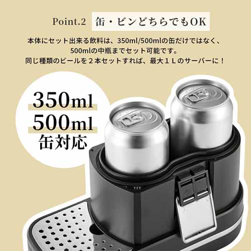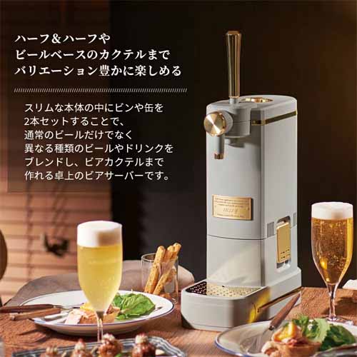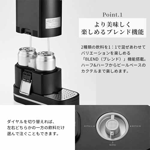 350ml/500ml缶だけでなく、500mlの中瓶も2本セットすることができて、濃厚で美味しい泡を楽しめます。この製品の優れた点がブレンド機能。違う種類のドリンクをセットして混ぜ合わせることで、ハーフ&ハーフやビールベースのカクテルまでつくれます。